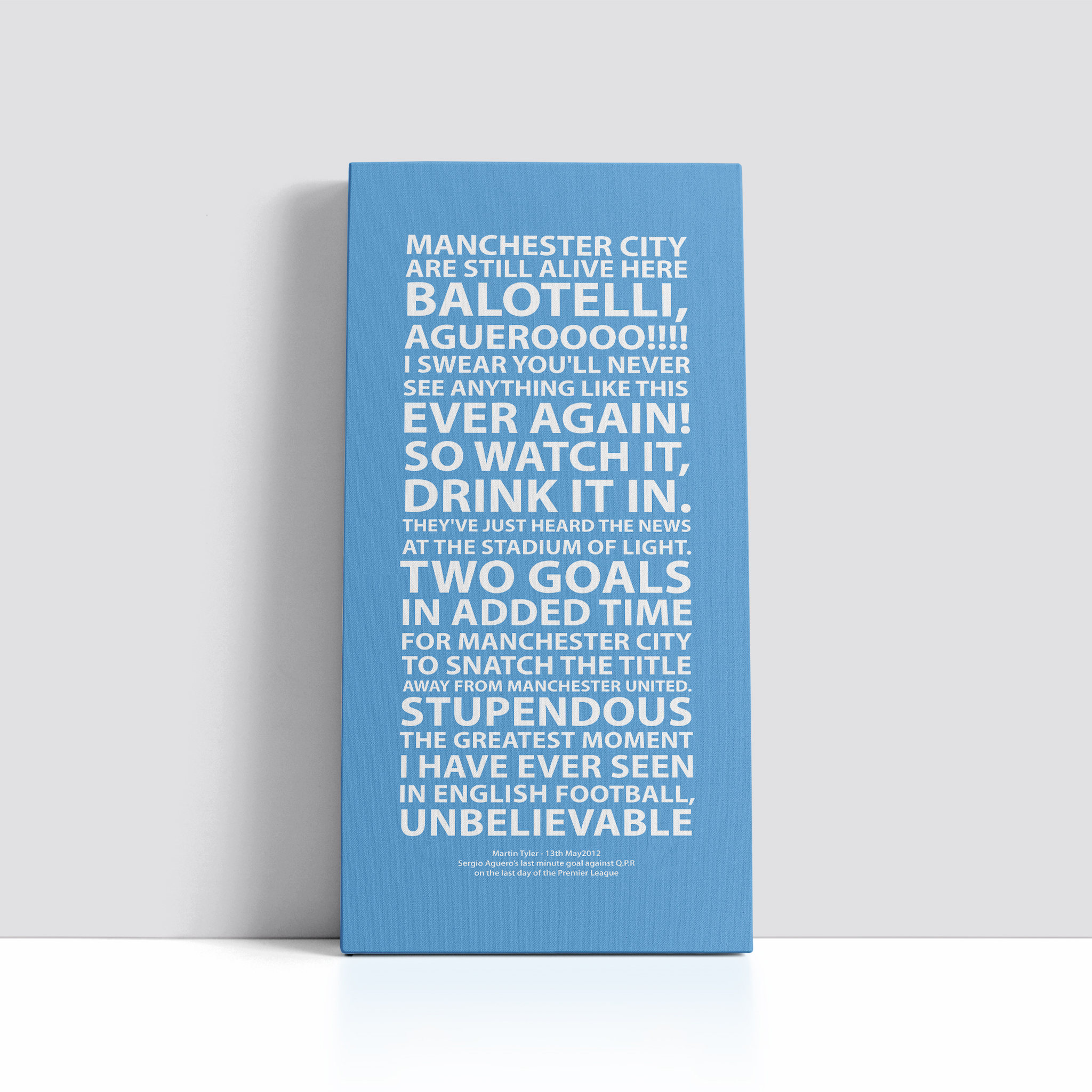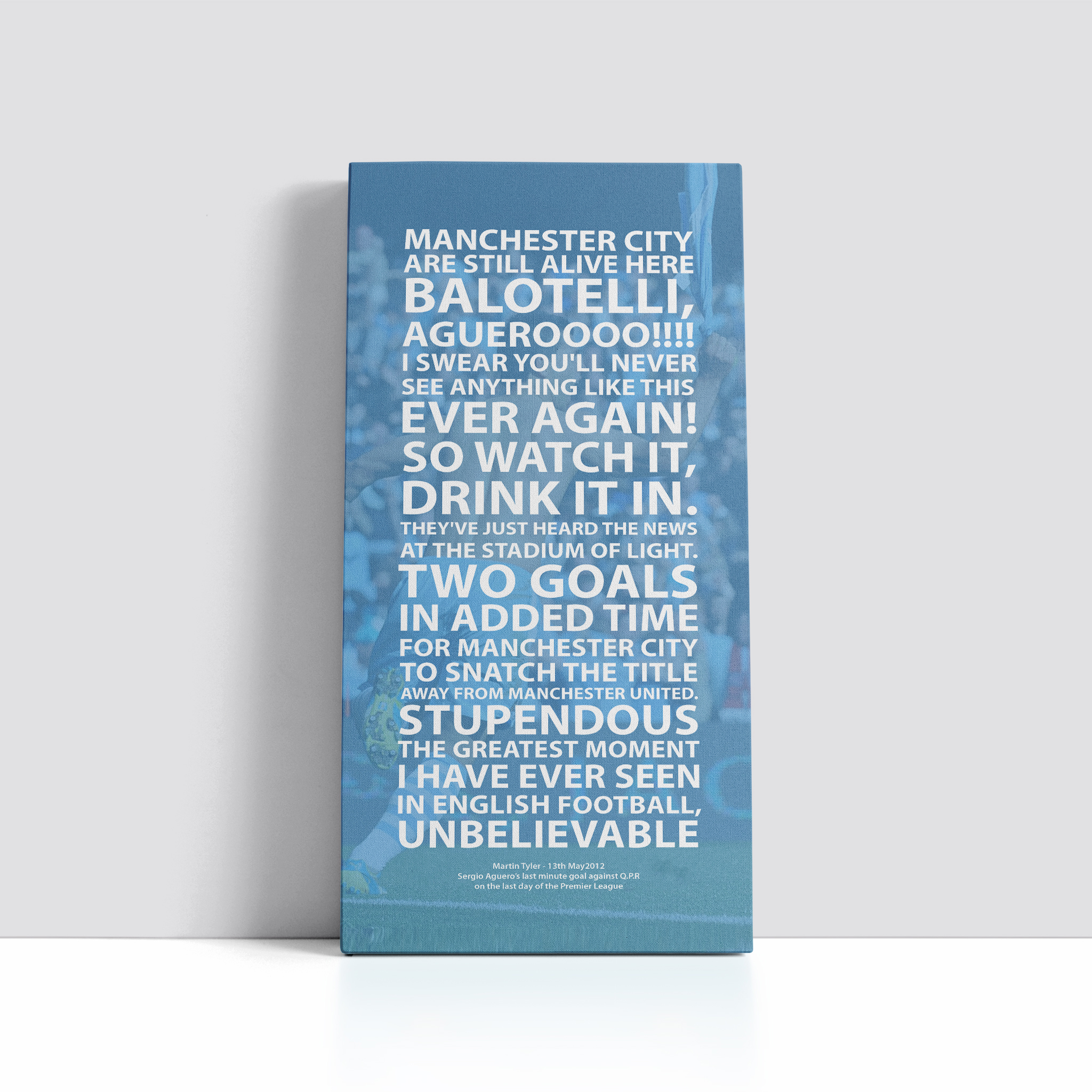 This is our Aguero Canvas, taken from the words of Martin Tyler, before and after Sergio Aguero scored the dramatic last minute goal against Queens Park Rangers on 13th May 2012 to WIN the Premier League for Manchester City on the final day of the Premier League, we also will be donating £5 for every single product sold to the Charity ‘Team Sementa’