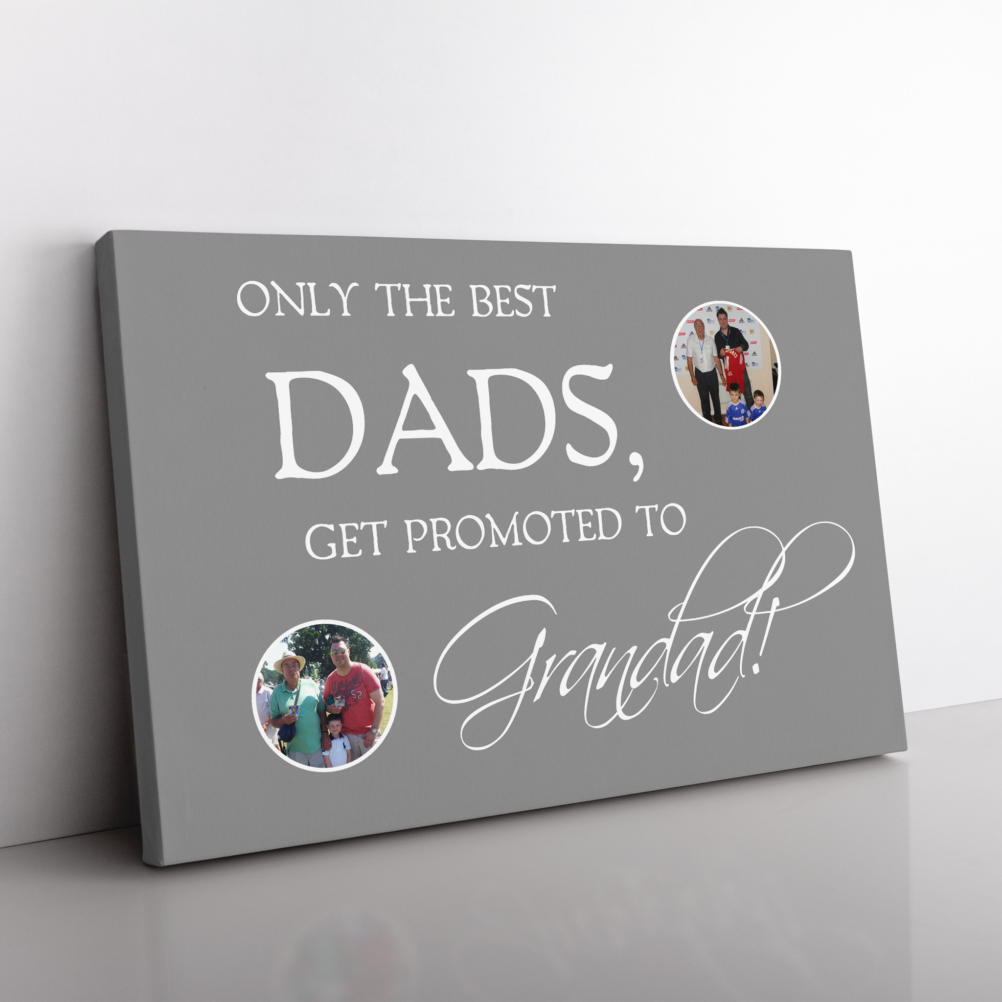 A Perfect personalised Canvas for Fathers Day or a gift anytime of the year. Upload your favourite image of your dad with their son or daughter and then another image with their grand children to make a perfect personalised gift. Upload all your image(s) for this in the section above then we will send you an email with a proof and upon approval we can print and process.The canvas comes in 3 different sizes and is made with the same High Quality materials and we use our amazing 12 Ink High Definition Epson Print to great this amazing canvas. Each canvas is framed on our High Quality 38mm thick Gallery Frame for that WOW finish.