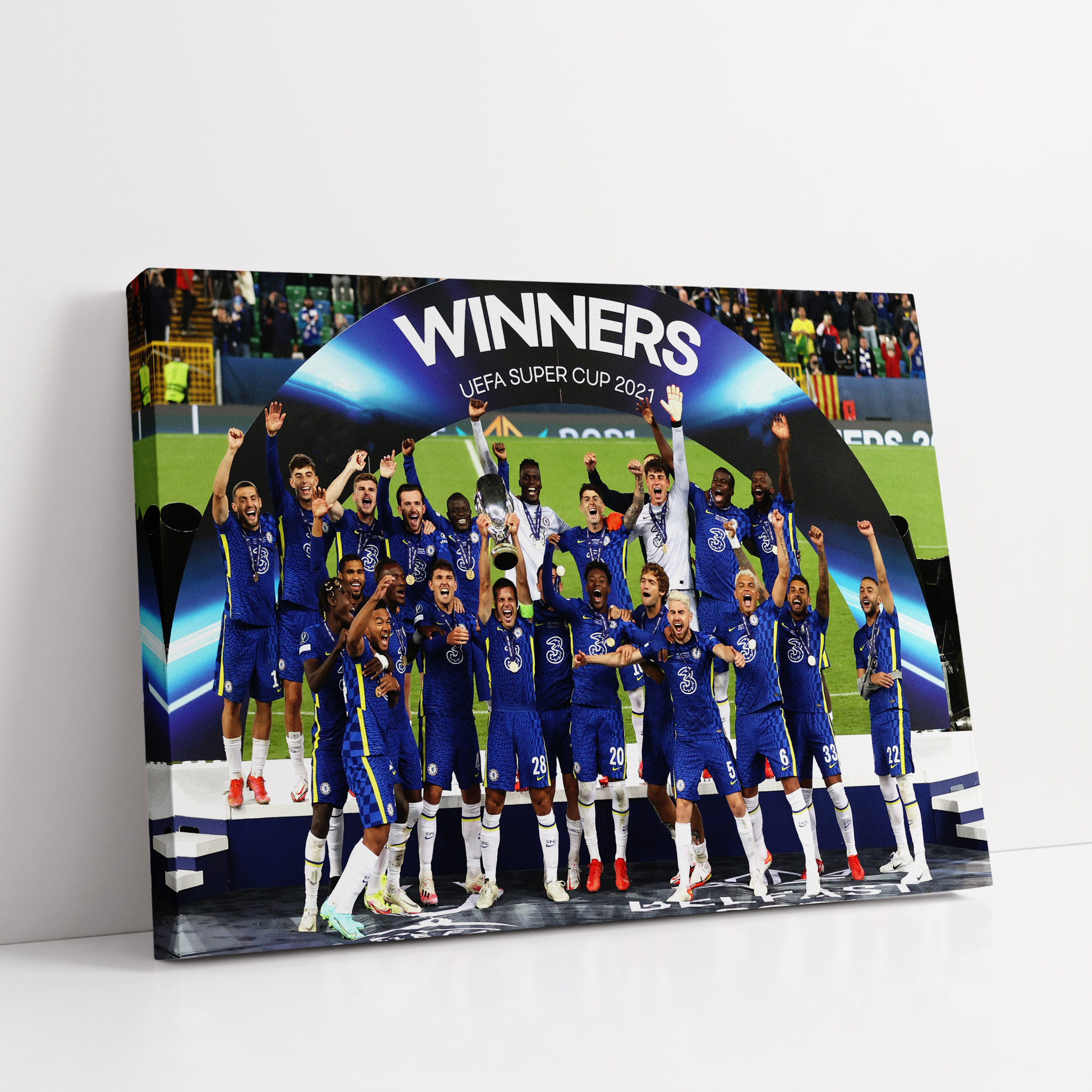 This is our Chelsea Super Cup Winners 2021 Canvas & Post Prints, which is apart of our Sports Collection. This taken from the Super Cup Final on Wednesday 11th August 2021 where Chelsea beat Villareal 6-5 after penalties! This canvas comes in three different sizes; 20×12″, 24×14″ and 30×18″, each canvas is wrapped on our 38mm Gallery Frame and come with a saw tooth hanger ready to hang proudly on the wall! Also we have the product available in traditional sizes in Luster Poster too!