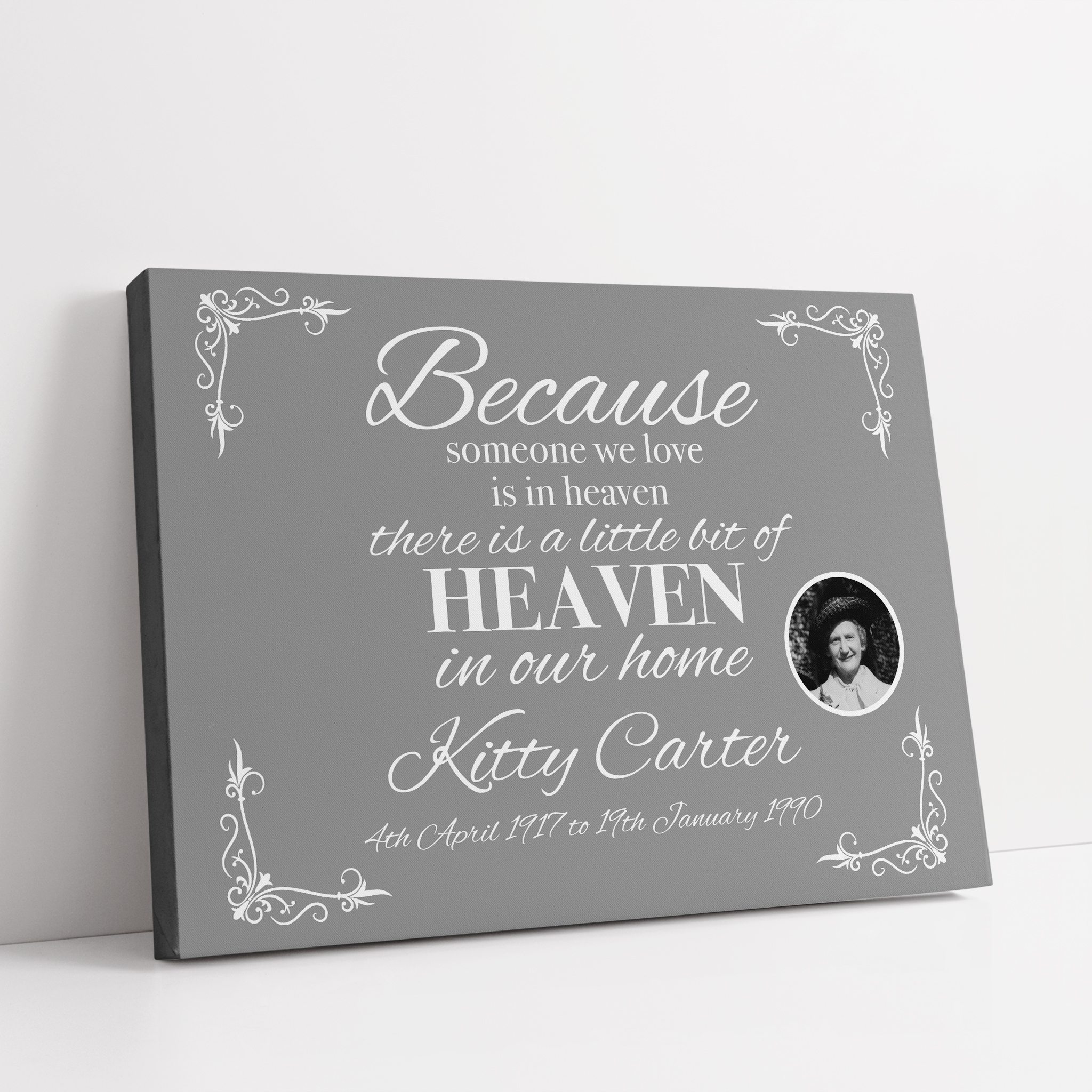 A Perfect personalised Canvas to remember that special person who is no longer with us. This canvas is created with the words stated in our example image, and then added the chosen name and dates along with a special picture of the person which will be transferred to black and white.