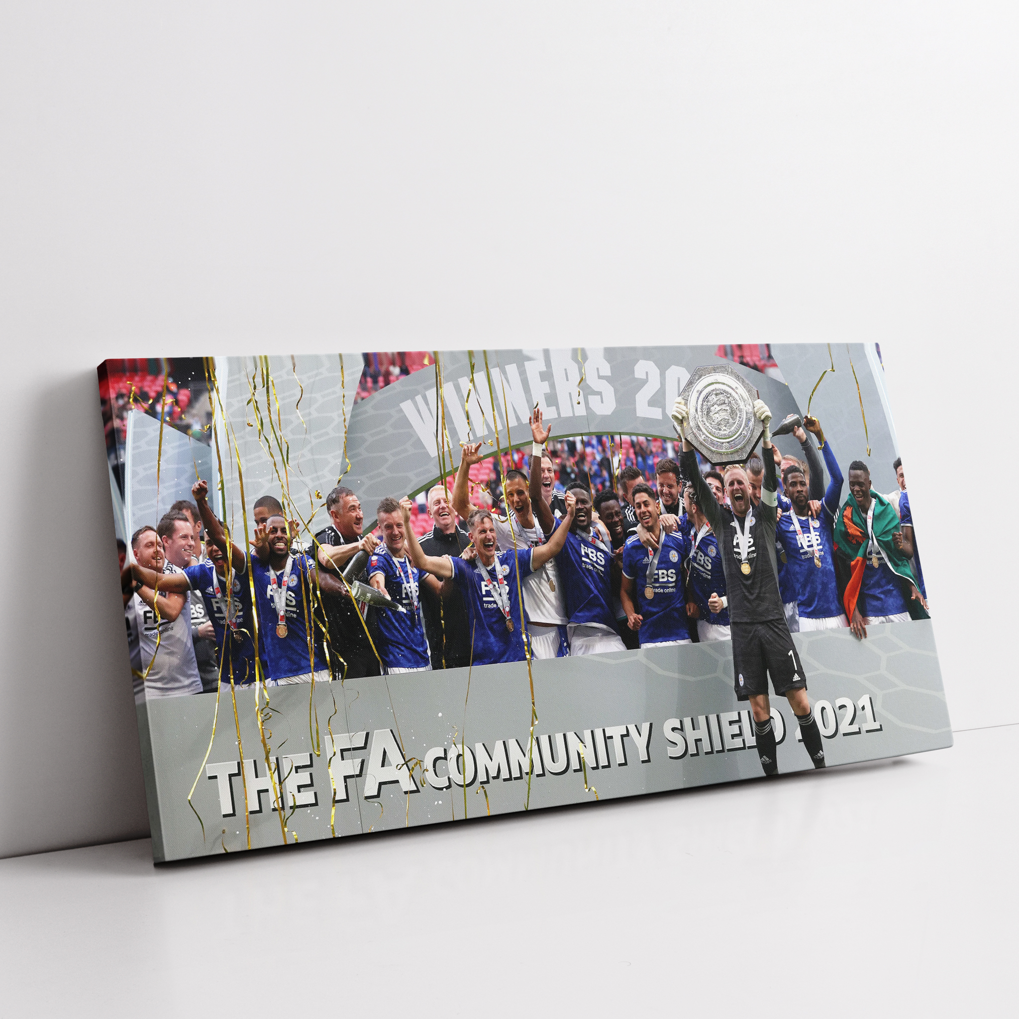 This is our Leicester City Community Shield Winners 21/22 Canvas v2, which is apart of our Sports Collection. This taken from the Community Shield Final on Saturday 7th August 2021 where Leicester City beat Manchester City 1-0! This items comes in canvas sizes; 20×12″, 24×14″ and 30×18″, each canvas is wrapped on our 38mm Gallery Frame and come with a saw tooth hanger ready to hang proudly on the wall!