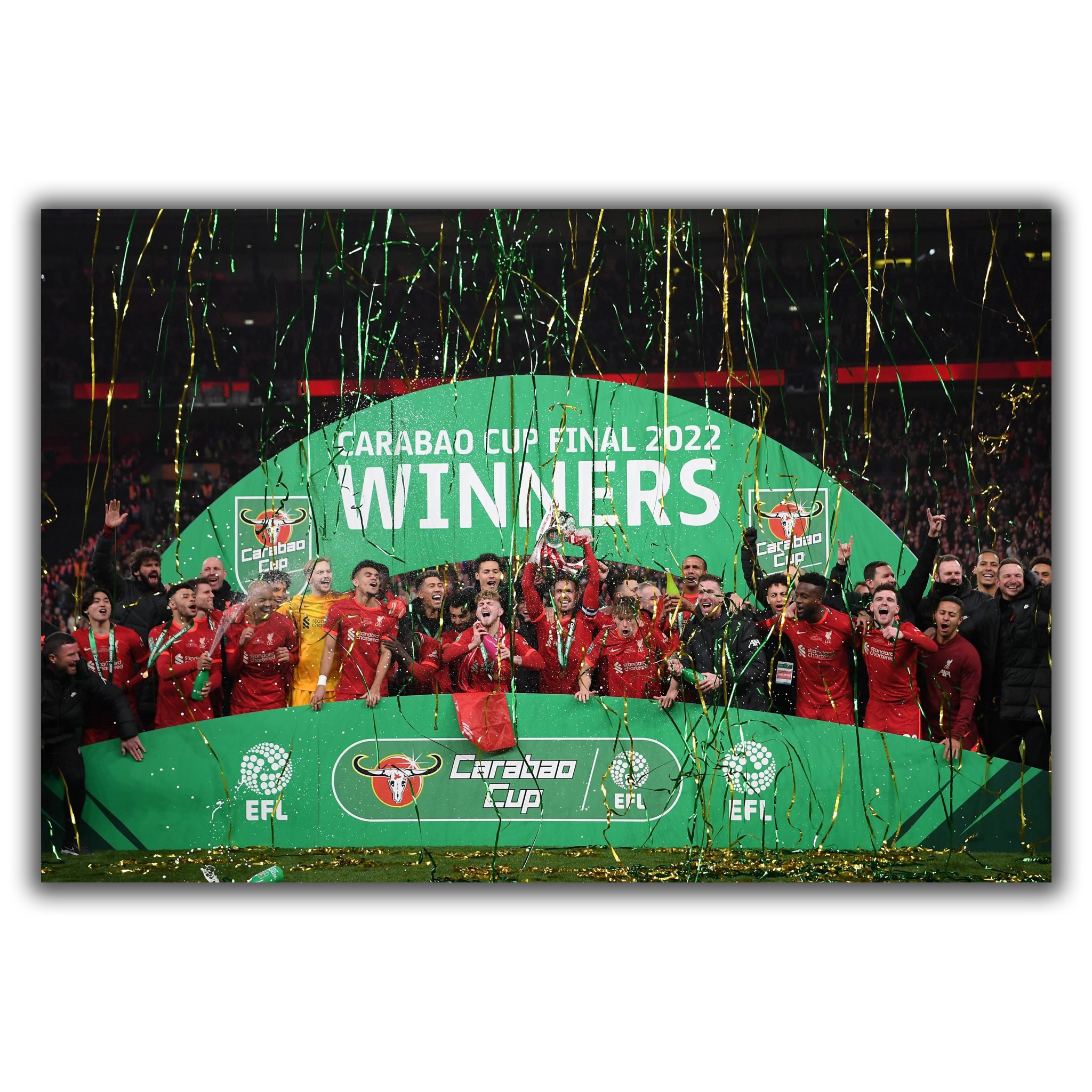 This is our Liverpool Carabao Cup Winners 2022 Canvas & Post Prints, which is apart of our Sports Collection. This taken from the Carabao Cup Final on Sunday 27th February 2022 where Liverpool beat Chelsea 11-10 after penalties! This canvas comes in three different sizes; 20×12″, 24×14″ and 30×18″, each canvas is wrapped on our 38mm Gallery Frame and come with a saw tooth hanger ready to hang proudly on the wall! Also we have the product available in traditional sizes in Luster Poster too!