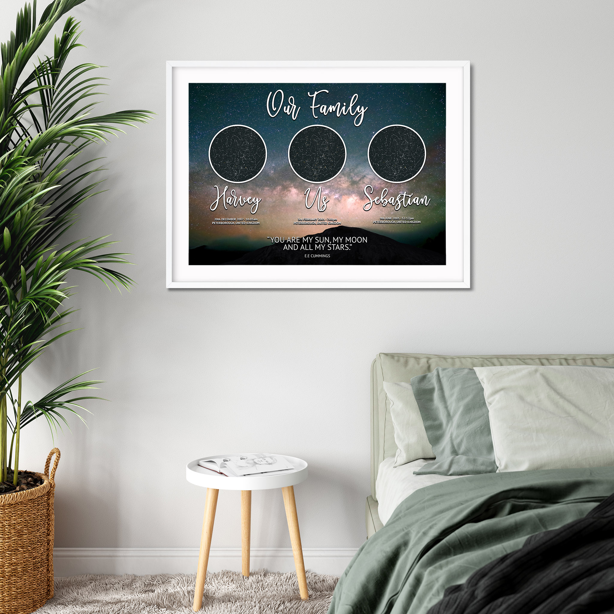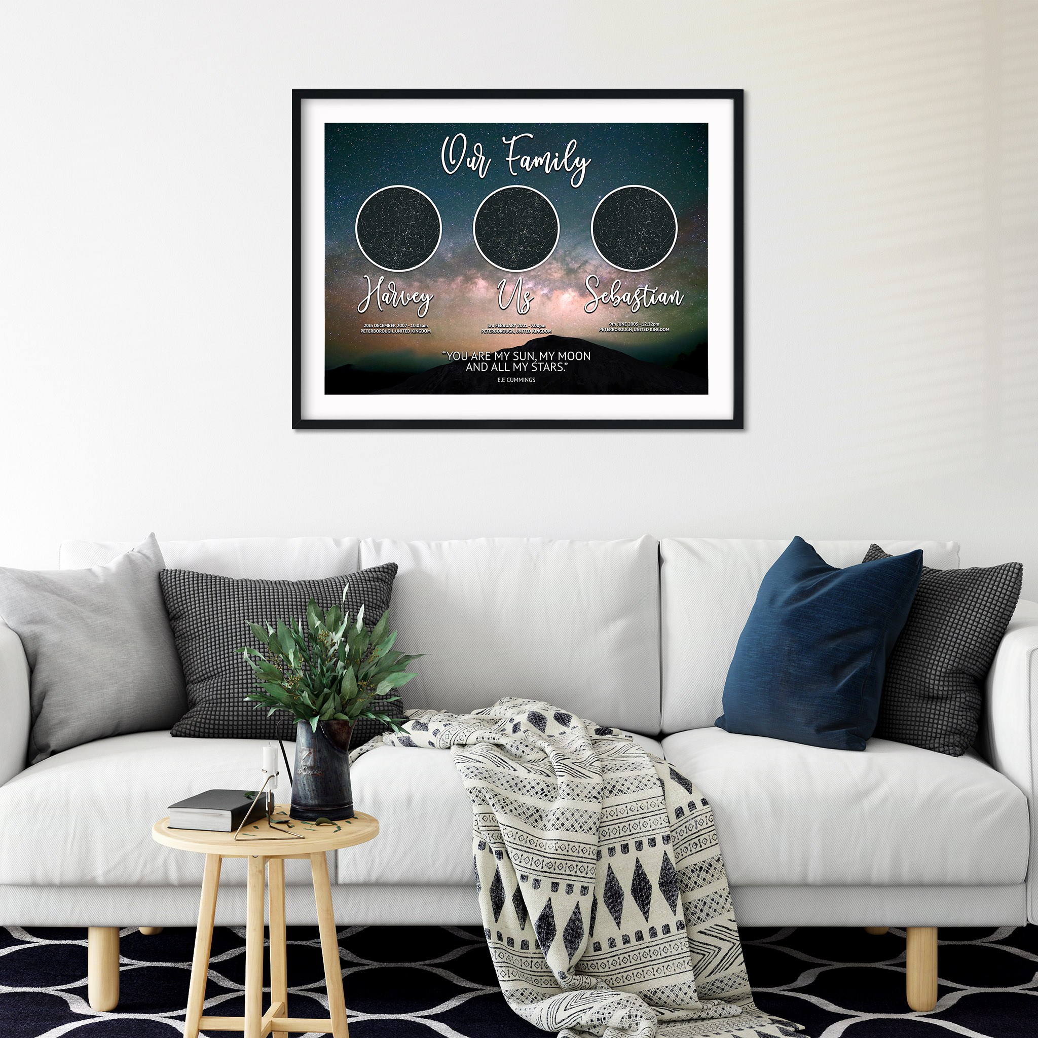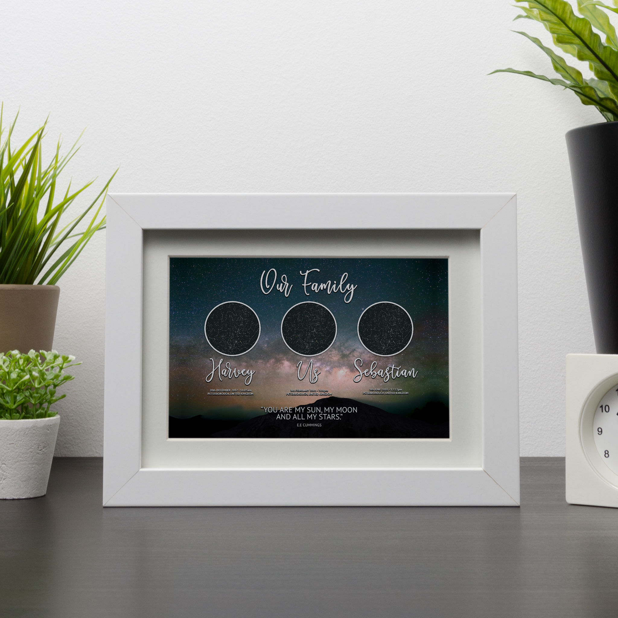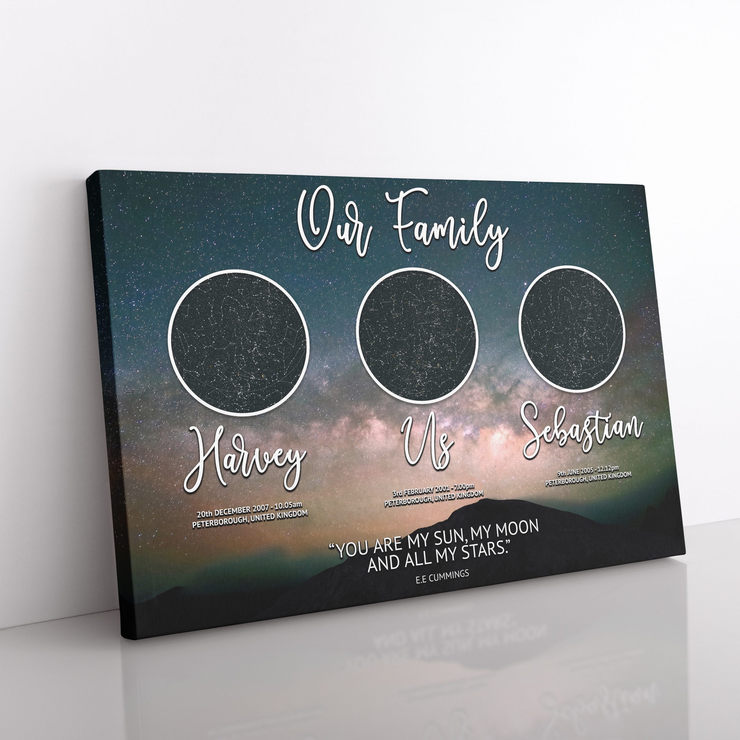 We are very delighted to have our amazing Star Map Family Version 1 which comes in one design but has various sizes and finishes! A perfect personalised gift getting the star constellation from a moment in time which is very personal to you and your family. The design has the date that you met followed by the date of birth for your children, we will design this all for you and all you need to do is choose the format you would like it printed on.